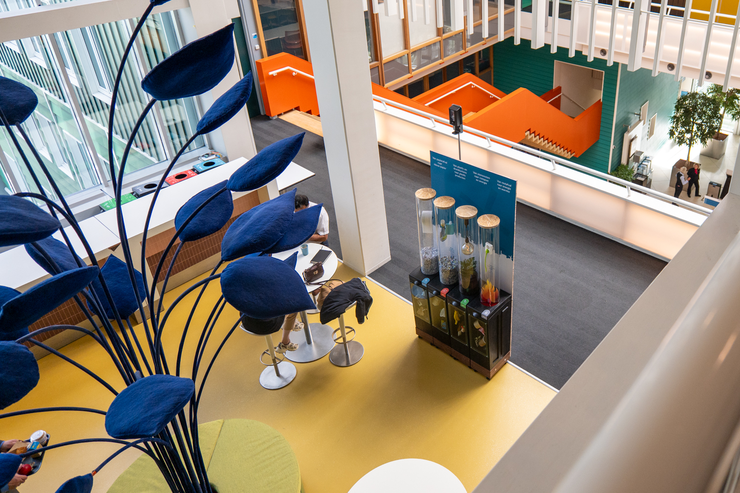 Maar afval reduceren stopt niet bij het neerzetten van de circulaire afvalmodules voor onder andere plastic, gft, papier. “De bakken neerzetten is stap één, maar dan ben je er nog niet,” vervolgt Tanja. “De grootste uitdaging zit bij de gebruiker: het afval moet natuurlijk wel in de juiste bak belanden.” GP Groot kwam, samen met dochteronderneming Circulair in Bedrijf, met een aantal ideeën om draagvlak te creëren voor het bewust omgaan met afval. Sascha vertelt over één van de initiatieven: “We hebben een showcase geplaatst waarin je kunt zien wat er met afval gebeurt: bijvoorbeeld papiersnippers met daarboven de producten die ervan gemaakt worden. Dat maakt het tastbaar en mensen worden er enthousiast van. Storytelling helpt enorm. Extra leuk aan deze showcase is dat hij is gemaakt van niet meer bruikbare Bontons. Zo geven we ook die een tweede leven. ”